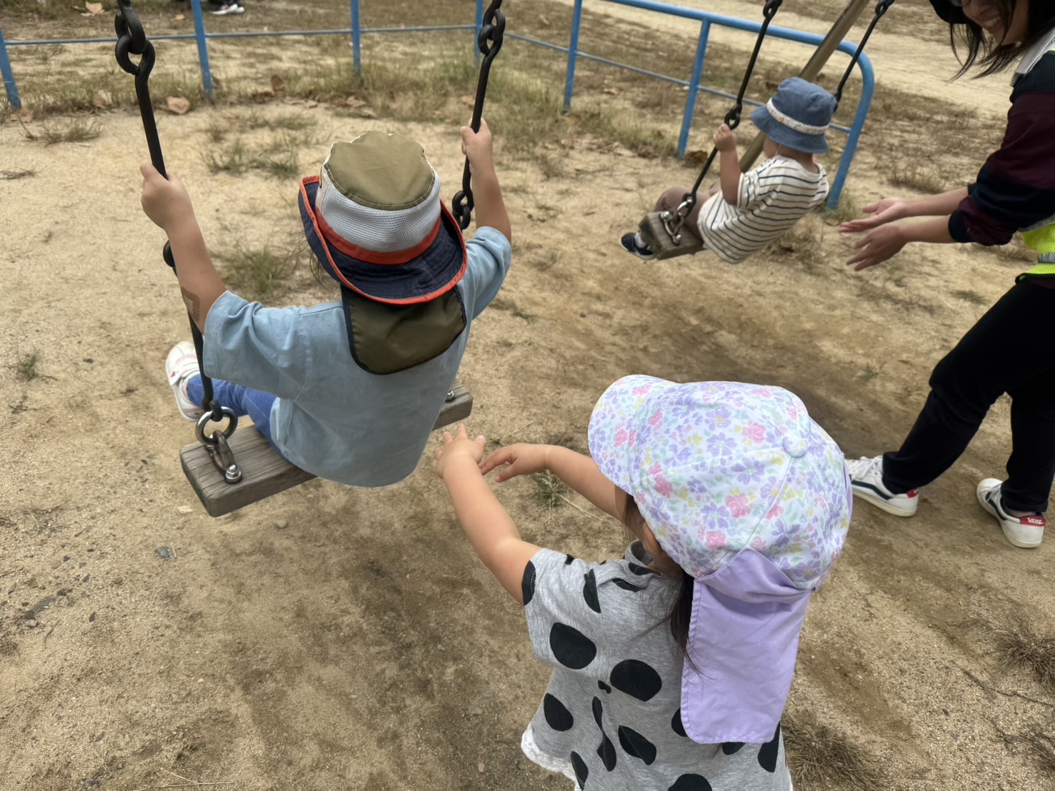 日々の事 公園🛝でのひとコマ✨ 投稿日:2025年10月21日 公園での遊びも楽しい季節になりました。 バッタ🦗を見つけたり、 ブランコをしたりと 気持ちよい風を感じています。 -日々の事 -お友だちの背中を押してあげる!の声✨, バッタを見つけたり, ブランコをしたり, 交代で、押し合いっこ☺️, 公園でのひとコマ, 公園での遊びも楽しい季節になりました!, 気持ちのいい風が吹いています✨, 秋