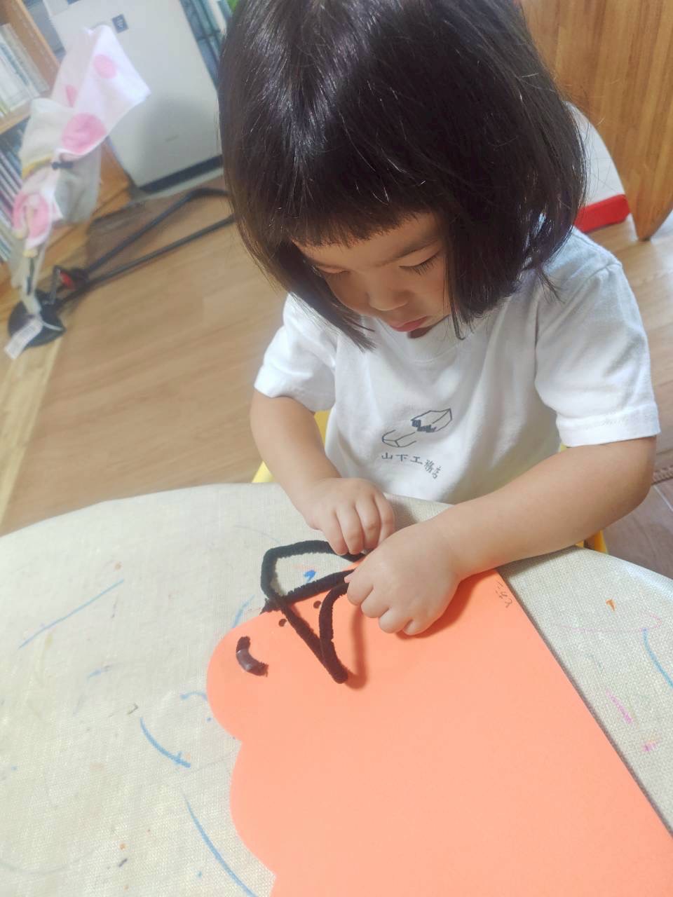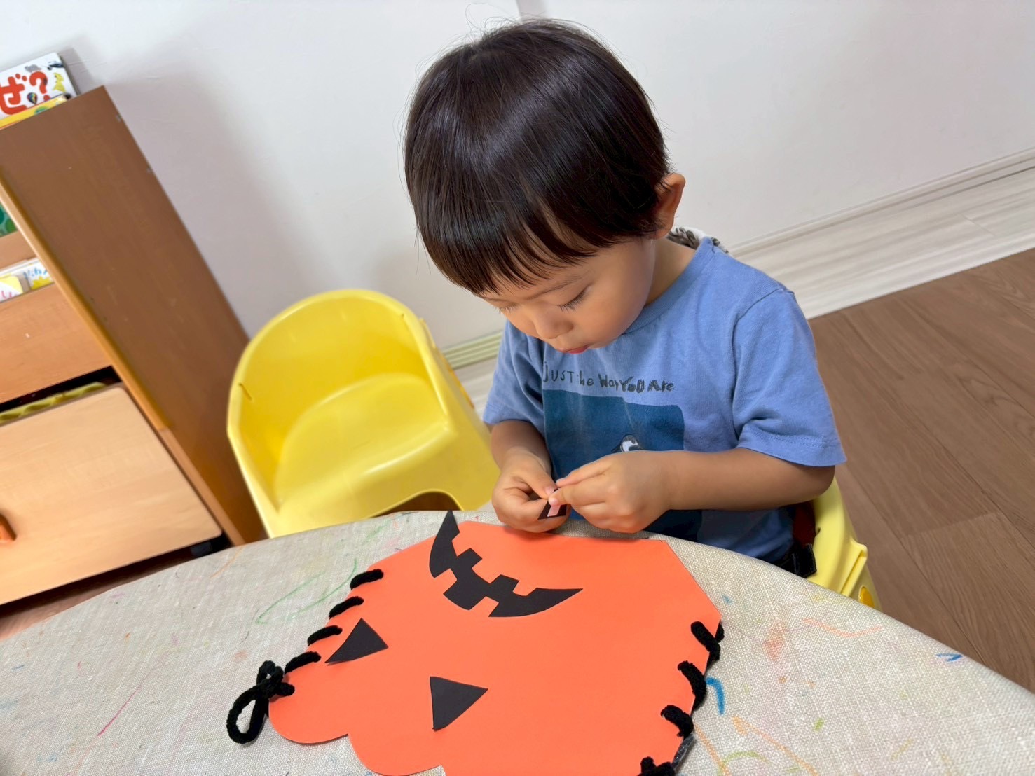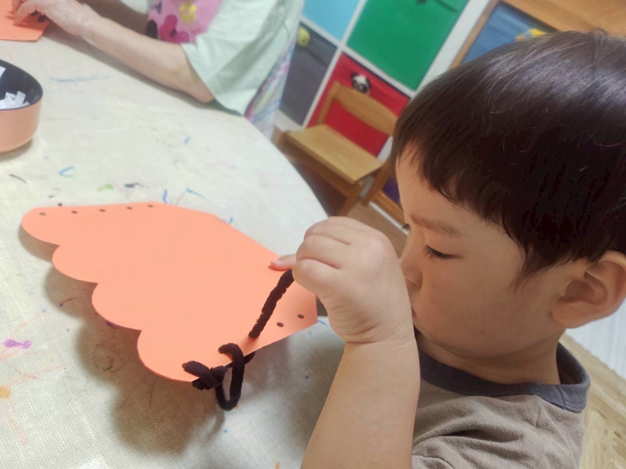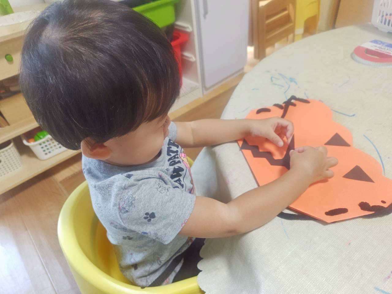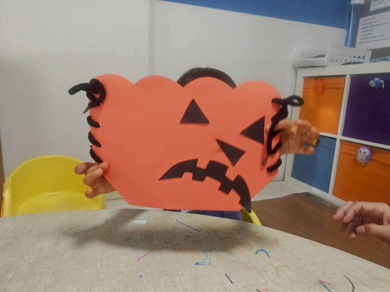 今回は穴を開けた画用紙にヒモを通してジャック・オー・ランタンを作りました。