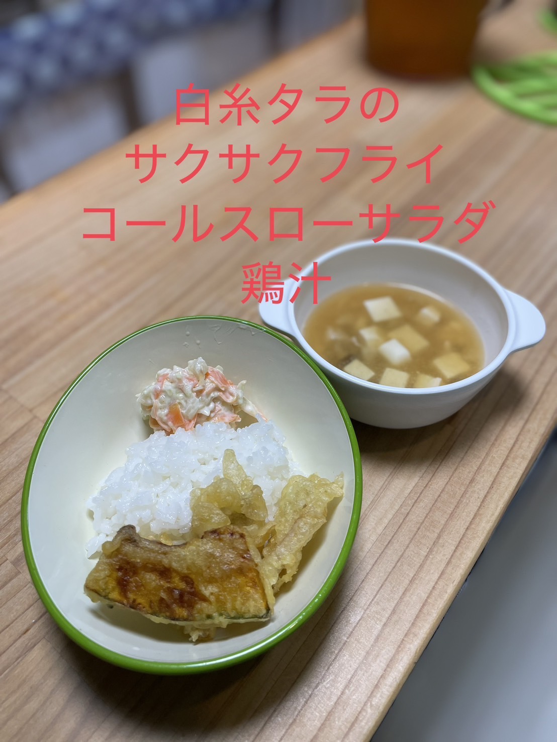 日々の事 給食 本日の給食🍽️ 投稿日:2025年10月22日 本日の昼食。 コールスローサラダのドレッシングは水切りヨーグルトを使用しています。 -日々の事, 給食 -コールスローサラダ, コールスローのドレッシングには!, みんなでニコニコいただきました☺️, みんな大好き あいちゃんの給食🍽️, 水切りヨーグルトが使用されています☺️, 白糸たらのサクサクフライ, 鶏汁✨